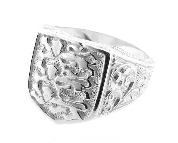 Sterling silver shield design 3 lions England ring. This ring represents strength, courage and bravery in the form of the lions and Man as protector with the shield shape of the ring.